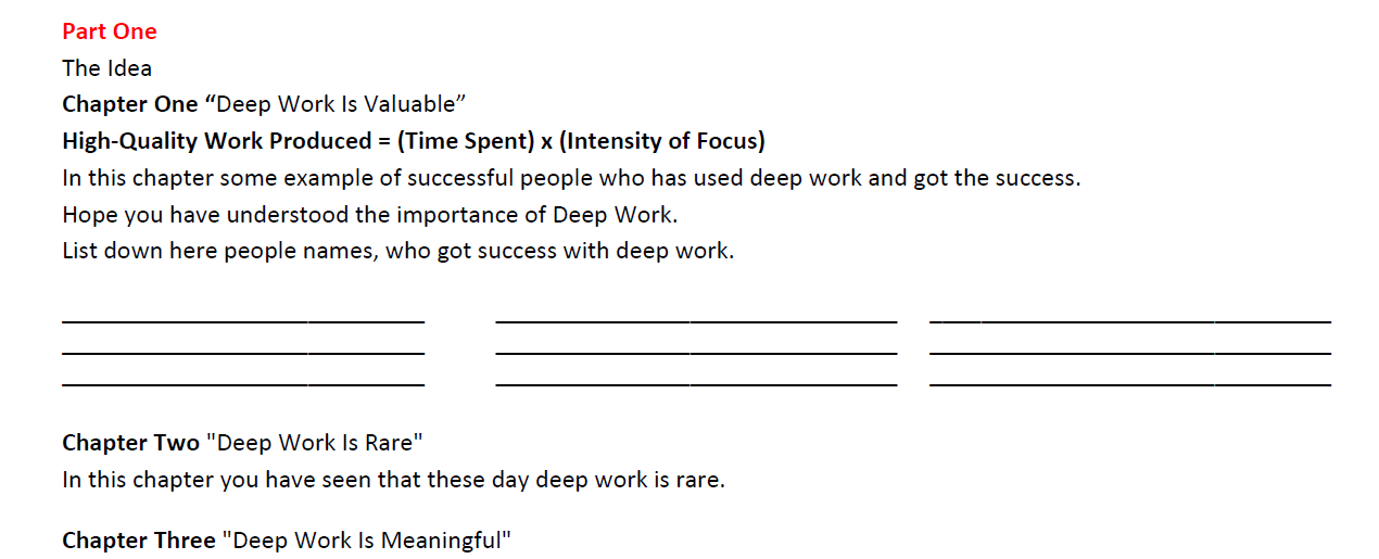 Deep Work – Workbook designed for maximum productivity. This book is designed as a substitute for the original book. You can read the book chapter wise after completion of each chapter you can complete your actionable item with our workbook. Use coupon code BOOK2022 to get a 100% discount.